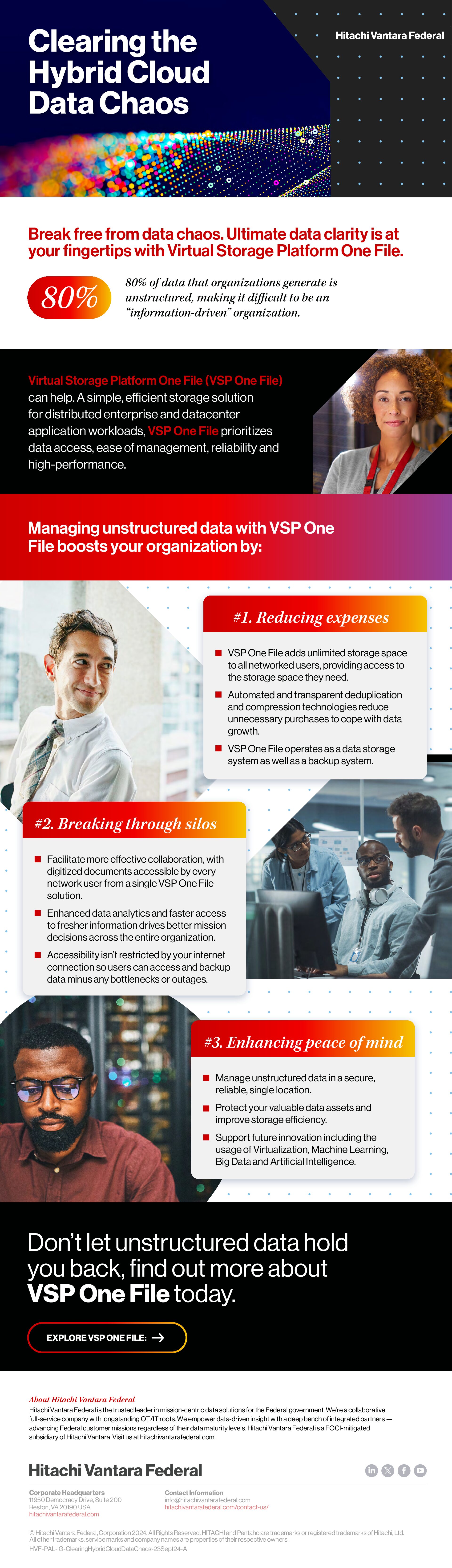 Virtual Storage Platform One File (VSP One File) can help. Download our infographic to see how a simple, efficient storage solution for distributed enterprise and datacenter application workloads can transform your organization’s data access, ease of management, reliability and performance.