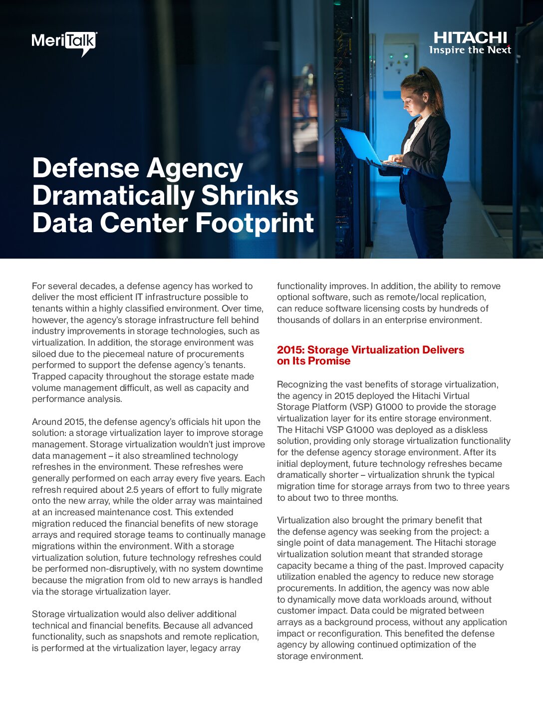 Discover how a U.S. defense agency with a highly classified environment undertook a remarkable transformation of its storage infrastructure. The journey began with storage virtualization to dramatically reduce refresh timeframes and eliminate stranded storage capacity, and it continued with modernization of the entire core storage infrastructure to reduce the data center footprint by 25 percent, enhance resiliency, and achieve significant cost savings.
