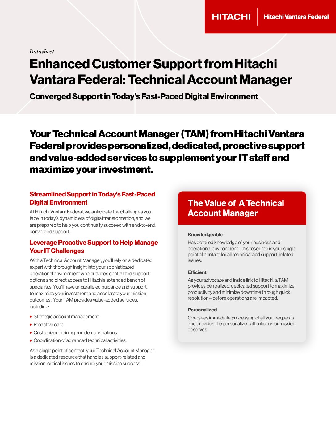 Get converged support in today’s fast-paced digital environment. A Technical Account Manager (TAM) from Hitachi Vantara Federal provides personalized, dedicated, proactive support and value-added services to supplement your IT staff and maximize your investment.