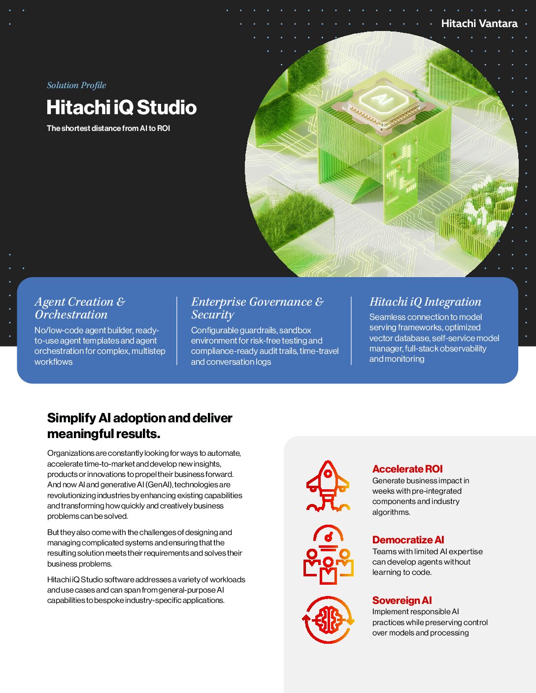 Hitachi iQ Studio software addresses a variety of workloads and use cases and can span from general-purpose AI capabilities to bespoke industry-specific applications.