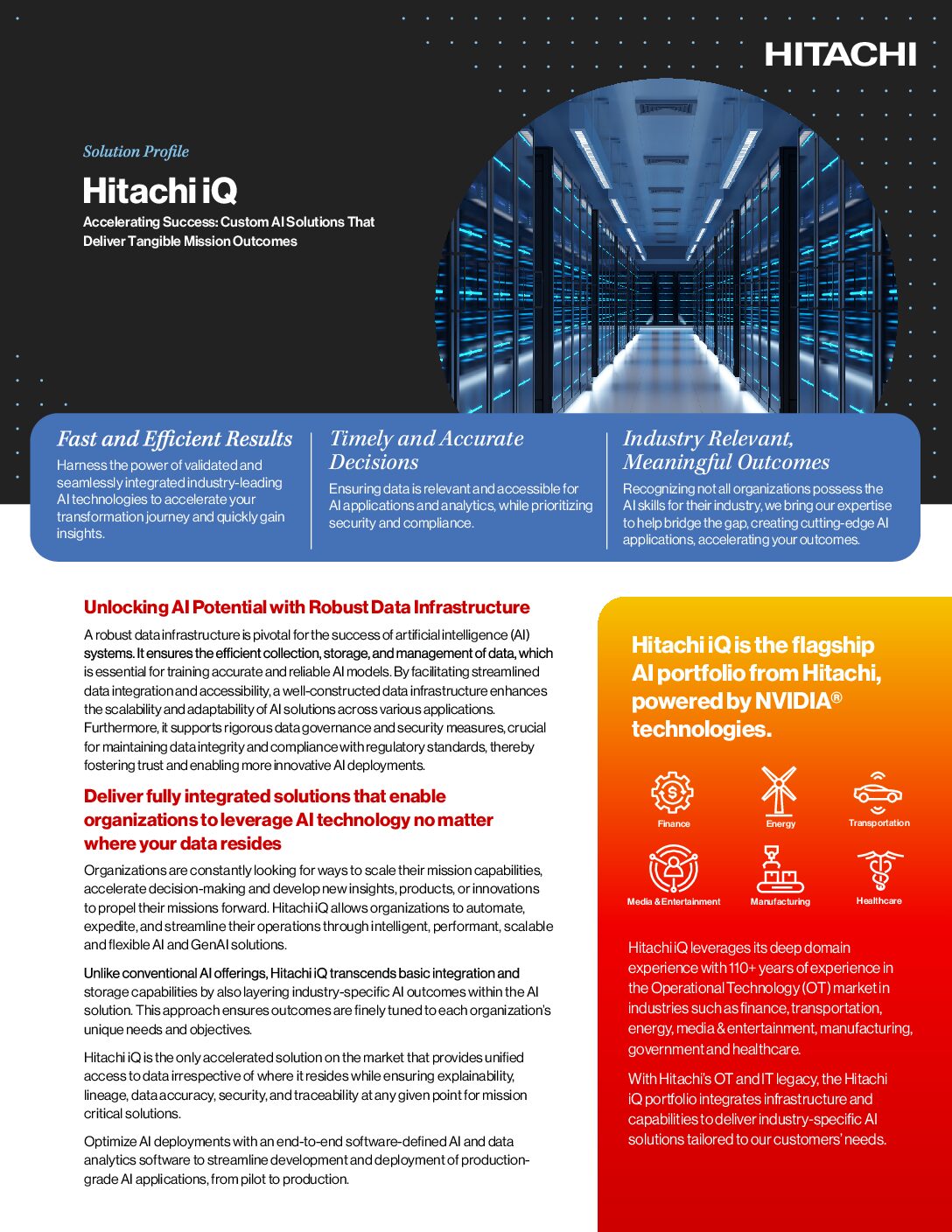 Download our solution profile for a look at how Hitachi iQ accelerates success through custom AI solutions that deliver industry-specific outcomes.
