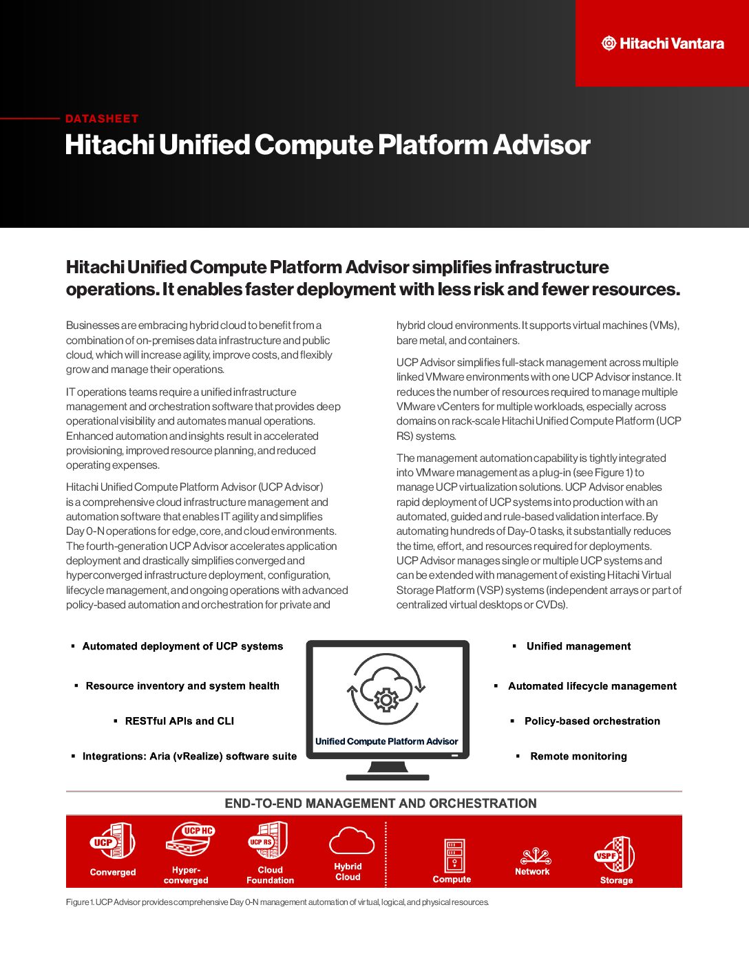 Hitachi Unified Compute Platform Advisor simplifies infrastructure operations. It enables faster deployment with less risk and fewer resources.