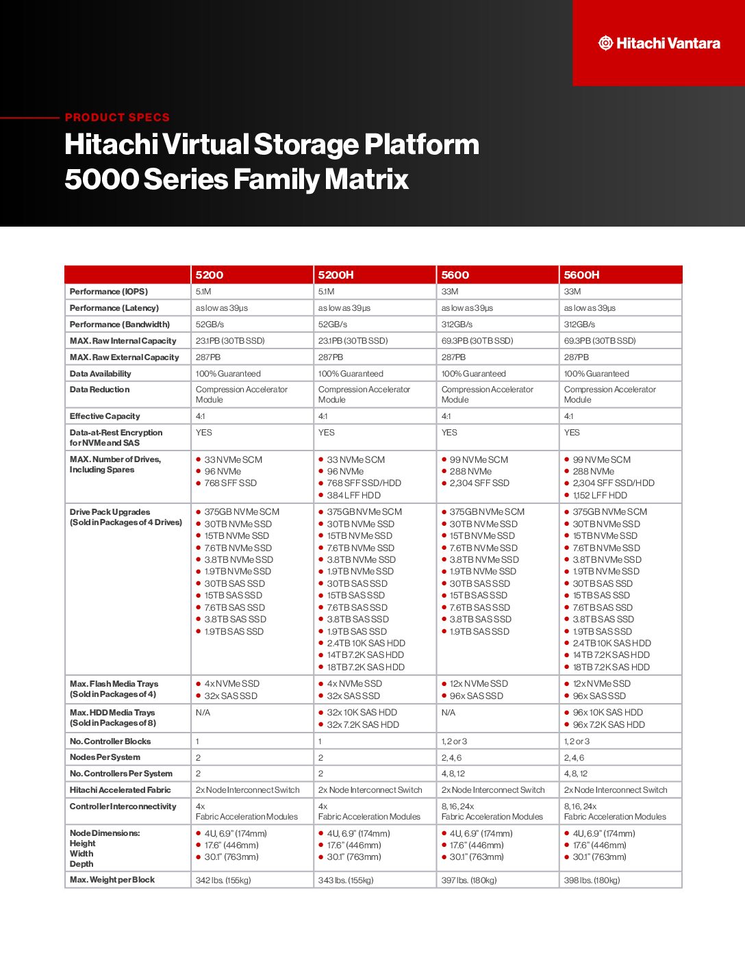 This spec sheet showcases the Virtual Storage Platform 5000 Series family of products including capacity, performance, scalability, features, and more.