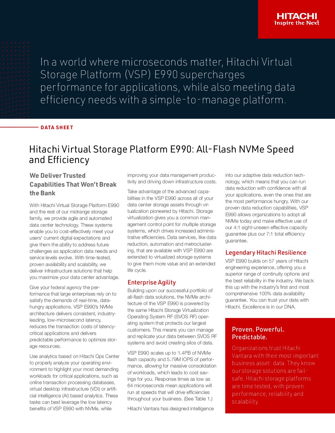 Read this datasheet to learn how the Hitachi VSP E990 supercharges application performance and works with Hitachi Ops Center to analyze your operating environment!