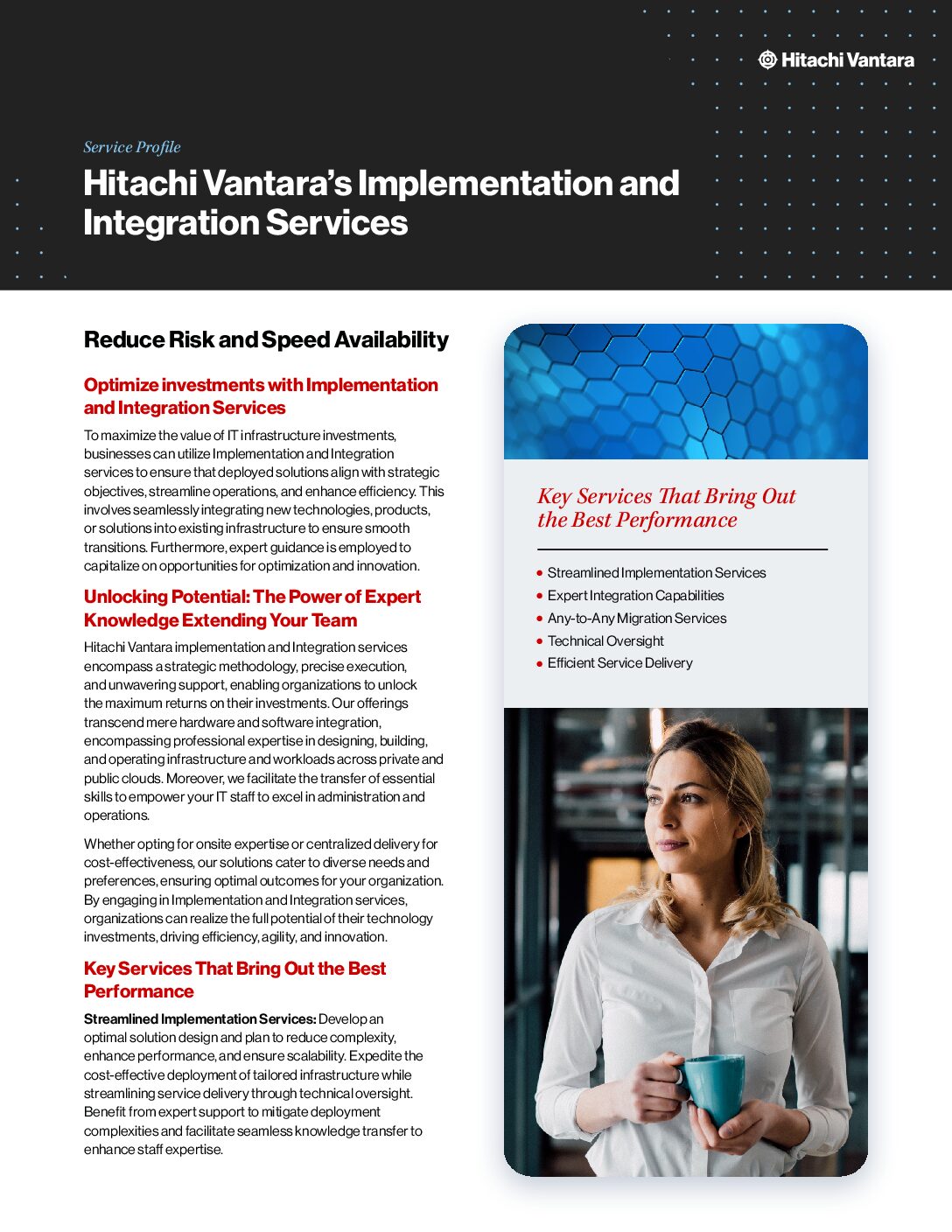 Download our service profile to see how Implementation and Integration services from Hitachi Vantara Federal are helping agencies to reduce risk and speed availability when onboarding new technologies.