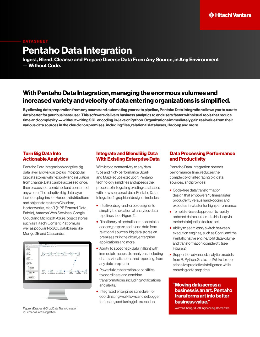 With Pentaho Data Integration, managing the enormous volumes and increased variety and velocity of data entering organizations is simplified.