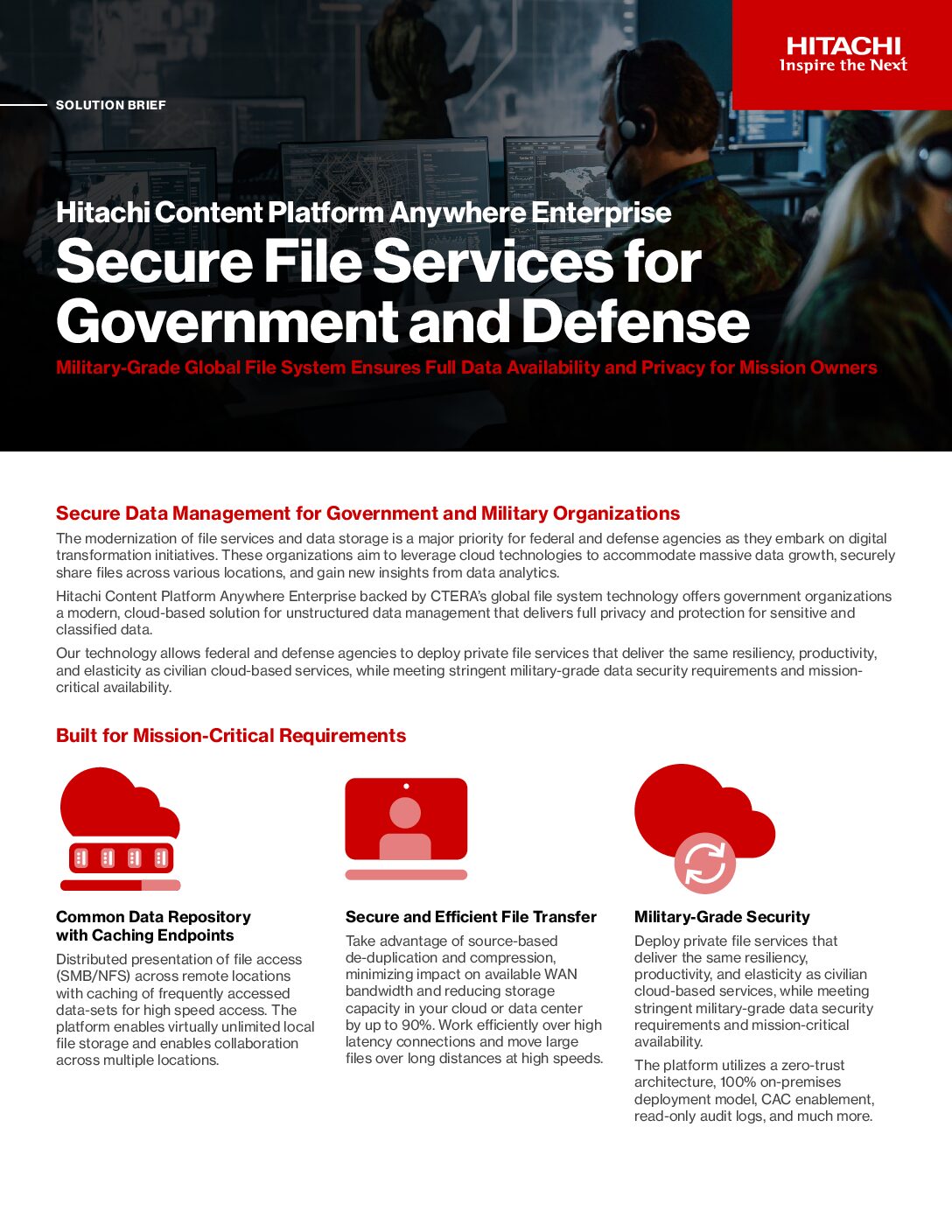 Hitachi Content Platform Anywhere Enterprise backed by CTERA’s global file system technology offers government organizations a modern, cloud-based solution for unstructured data management that delivers full privacy and protection for sensitive and classified data.