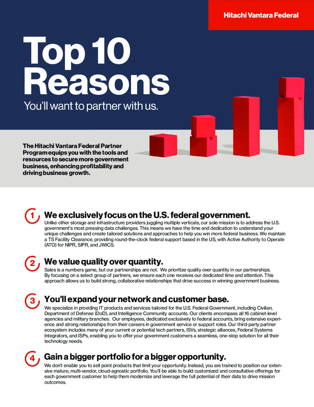 Download to find out the ten reasons you’ll want to consider partnering with Hitachi Vantara Federal to support your government practice!