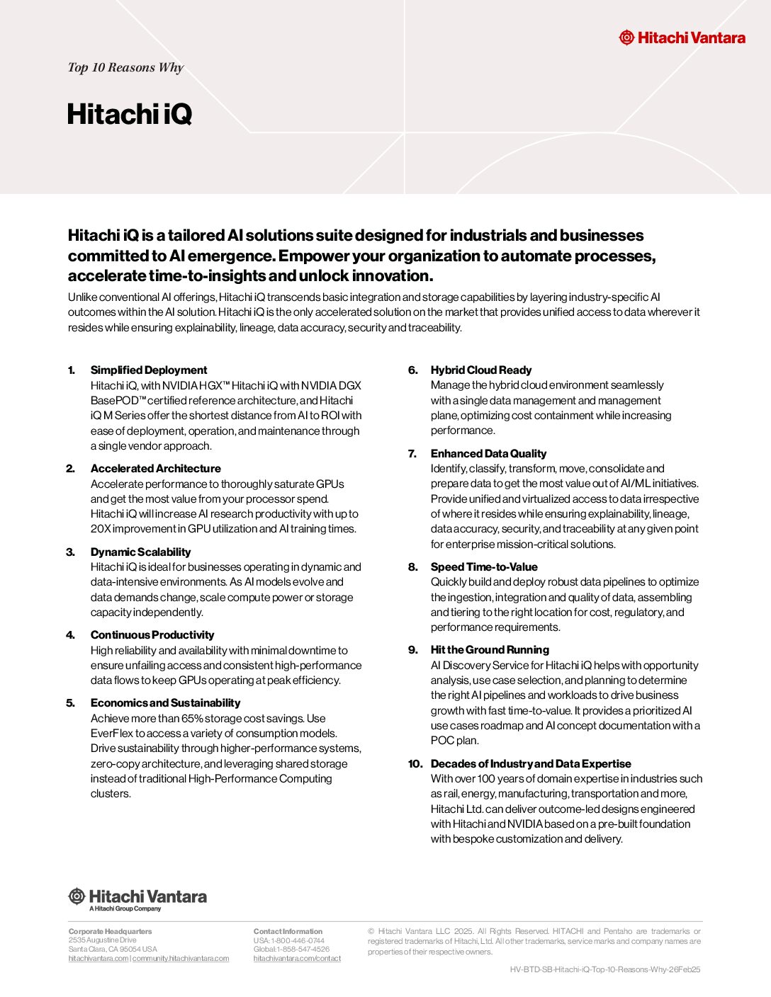 Empower your organization to automate processes, accelerate time-to-insights and unlock innovation with Hitachi iQ. Download our Top 10 Reasons Checklist to learn more.